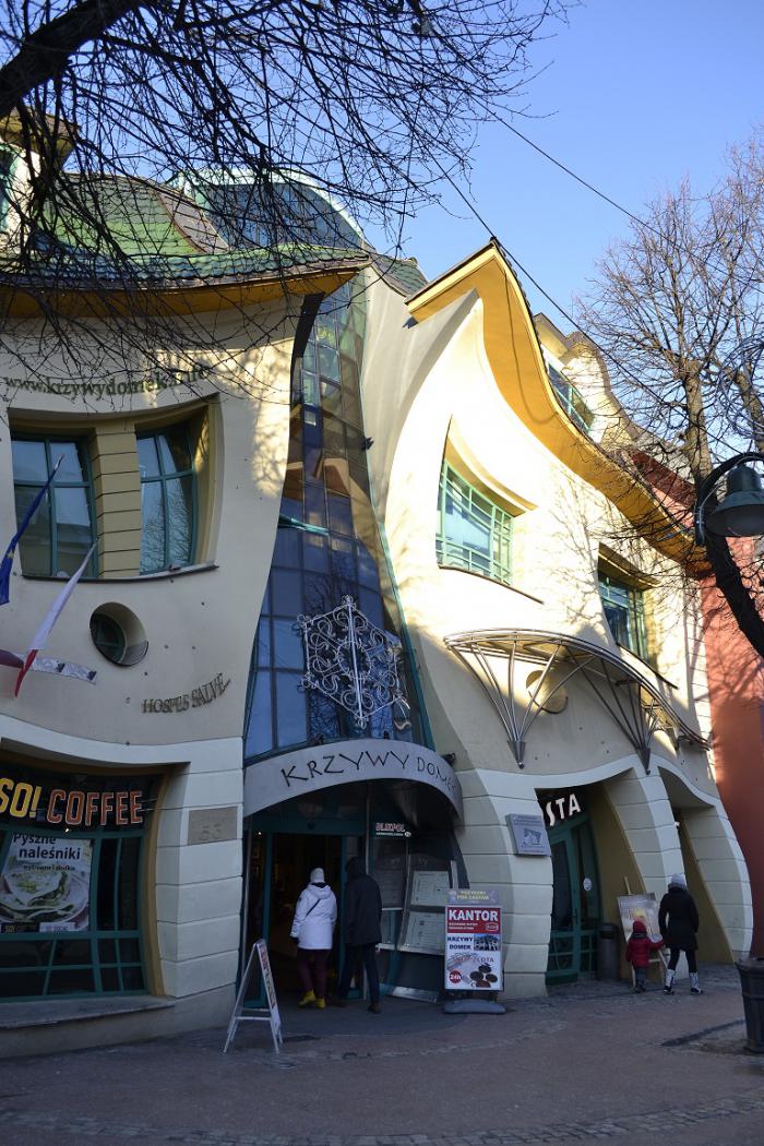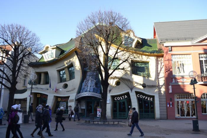 Ну и как же не посетить и не сфоткать Krzywy Domek, идея строительства которого родилась в 2001 году у архитекторов Шотинского и Залевского. Вскоре проект был одобрен, и уже спустя три года здание было торжественно открыто в центре города на улице Героев Монте-Кассино. Архитекторы признаются, что вдохновение черпали из работ художников Пера Оскара Дальберга и Яна Марцина Шанцера.