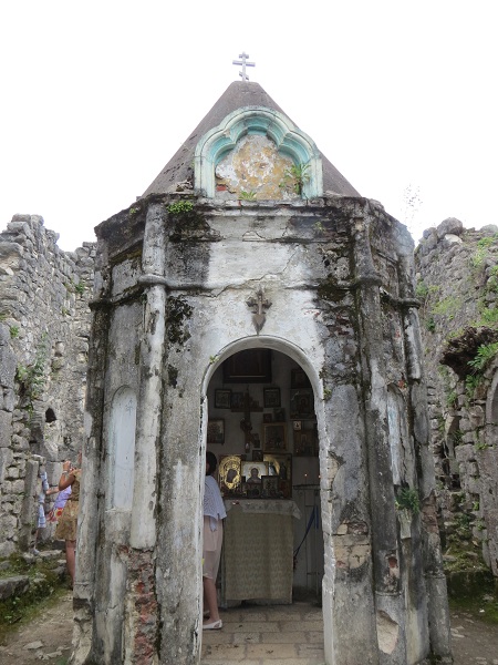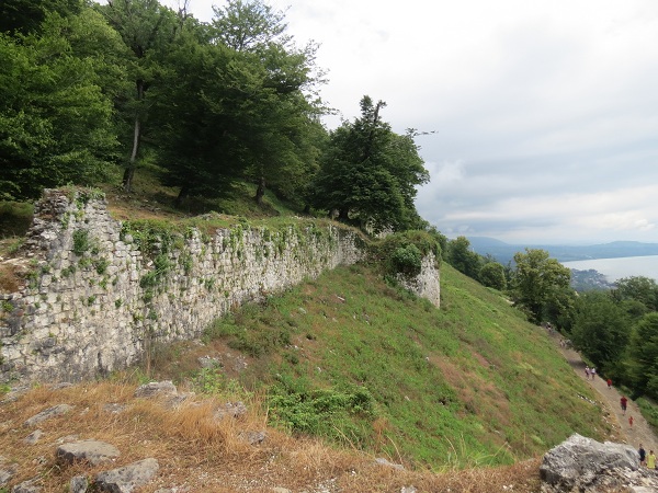 От парковки Новоафонской пещеры нужно проехать еще около 2 км. Наверху имеется своя небольшая парковка (43 05.576’, 040 48.159’), стоимостью опять-таки 150 рублей. Но и от нее придется прилично топать в гору по извилистой лесной дорожке, огибая руины крепостных стен и любуясь открывающимися панорамными видами. Не забудьте в кассе рядом с парковкой приобрести билеты в Национальный Новоафонский историко-культурный заповедник «Анакопия» по 150 (загадочная цифра Абхазии) рублей за человека и вперед к цели – Анакопийской крепости, которая возвышается на 350 м над уровнем моря, а потому является не только интересным историческим памятником, но и превосходной смотровой площадкой.
