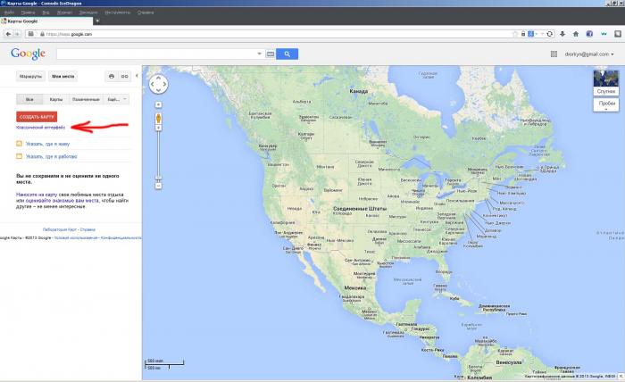 Прежде, чем приступить к прокладке маршрута, переходим во вкладку «Мои места», и жмем «Классический интерфейс» (красную кнопку «Создать карту» не трогаем вообще).