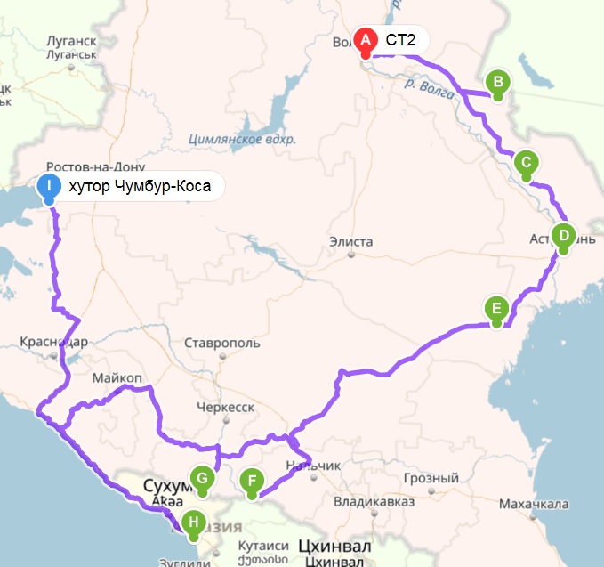 Волгоград, оз. Баскунчак, Реконструкций Сарай-Бату, Астрахань, дельта Волги, пустыни Калмыкии, Кавказские горы, Эльбрус, Домбай, Предгорье Кавказского хребта, Майкоп, Туапсе, побережье Черного Моря, Сочи, Гагра, Туапсе, оз. Рица, Сухум, Очамчыра., Чумбур — Коса