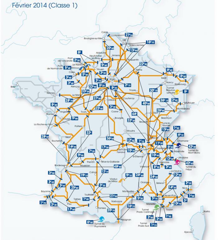 Объездные автобаны Парижа, Лиона, Бордо и Марселя бесплатные, также как и некоторые короткие участки автобанов вблизи границ (напр. Saarbrücken — Metz платная дорога, но только от St. Avold, т.е. от границы до St. Avold бесплатно. Проезд по участку St. Avold до Metz в настоящее время для а/м стоит 3,80. Опять же проезд между Metz и Nancy не стоит ничего).