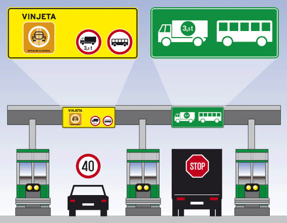 При поездке по автомагистралям и скоростным дорогам без виньетки или с неправильно размещенной виньеткой на транспортном средстве — взимается штраф в размере 300 и 500 евро.