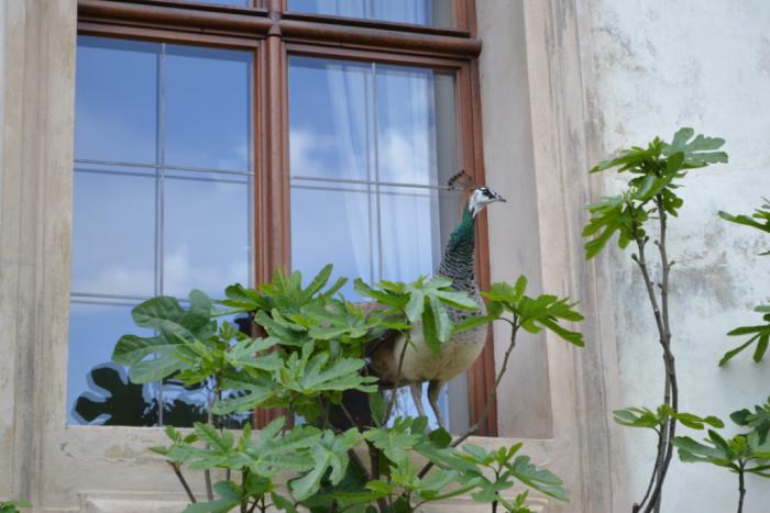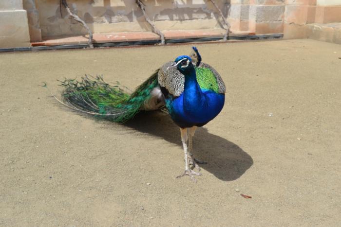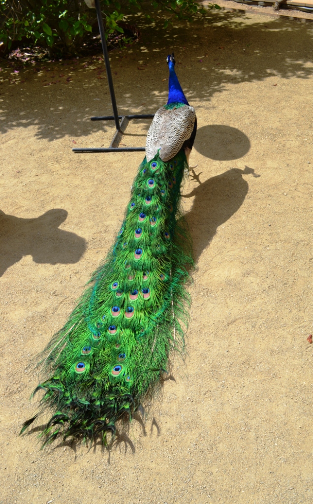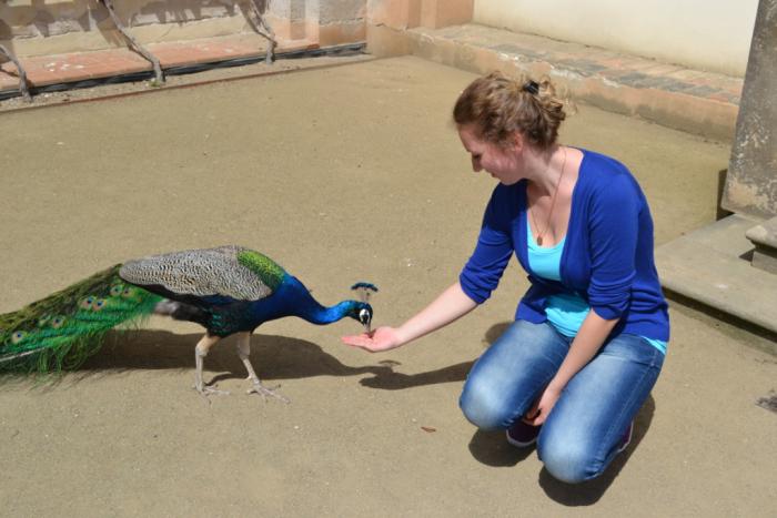 Женщина, прогуливающаяся по саду, подошла к павлину и начала его кормить. Она оказалась русскоязычной и, увидев наш восторг, предложила Наташе покормить его с рук, за что ей огромное спасибо!