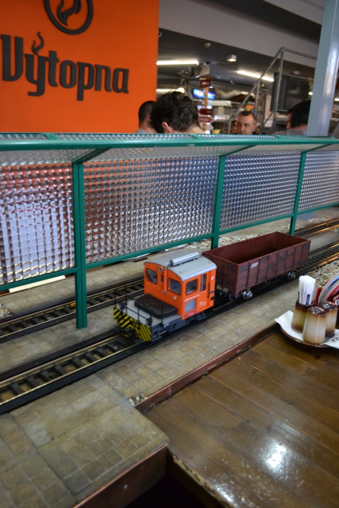 Во второй день мы посетили паб на Вацлавской площади под названием Vytopna, в котором паровозики развозят заказы по местам