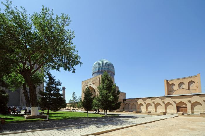Хотя этой мечети сразу не везло. По легенде, возводилась она ускоренными темпами. Предполагается, что заказчиком была любимая жена Тимура Биби Ханум. Надо было успеть к возвращению мужа из очередного похода. Архитектор готов был гонять рабочих круглые сутки при условии, что эта красавица его поцелует. К сроку мечеть уже стояла, вот только Тимур узнал о той сделке. Обиделся и велел жене убираться на все четыре стороны, позволив взять с собой самое ценное. Женщина заявила, что самым ценным считает своего мужа. Ну и как-то всё успокоилось. А архитектор сделал себе крылья и благополучно улетел.