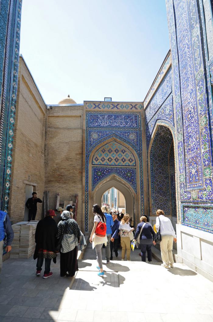 Дальше по плану базар Сиаб. Главное убедить всех пойти сперва в мечеть Биби-Ханум, а то после рынка это точно нереально. Двадцать две тысячи за вход. В рублях примерно сто шестьдесят рублей, звучит уже не так тревожно, но по сравнению с платой за Регистан вызывает вопросы. Там не в пример интереснее и многообразнее, а тут (возможно после уже увиденного) кажется скудновато. Отдать должное всё-таки надо. Внутри висят фотографии середины прошлого века. Разруха. Сейчас всё словно заново отстроено.