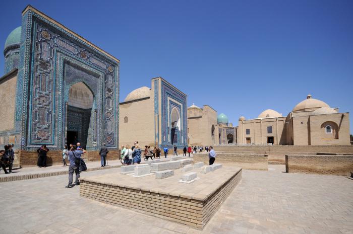 Дальше дорога ведет прямо к некрополю Шахи-Зинда. Главный вход за деньги, но мы зашли с тыла бесплатно, с нас и так по семнадцать тысяч взяли у Ходжи Данияра неизвестно за что. Сперва через ворота попали на кладбище и дальше естественным путем оказались в этом комплексе. Название переводится как «живой царь». Это связано с двоюродным братом пророка по имени Кусам ибн Аббас. В Узбекистане он обращал в ислам местных жителей. По легенде в момент совершения намаза на него и новообращенных мусульман напали пенджикентские язычники и всех перебили. Однако раненый Кусам ибн Аббас с помощью святого Хазрет Хызра смог укрыться в колодце Шаабан, где до сих пор продолжает жить. Отсюда и название. Пророк Мухаммед уверял, что Ал-Кусам-ибн-ал-Аббас больше всех людей похож на него внешностью и характером.