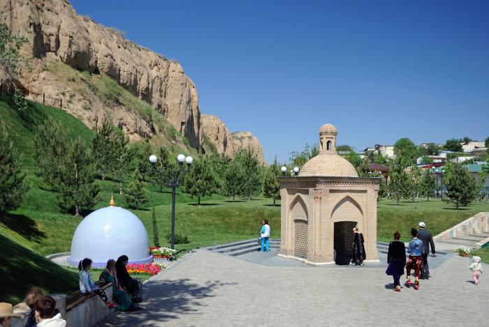 Сперва поехали к мавзолею Ходжи Данияра. В ветхом Завете он встречается под именем пророка Даниила. Почитается не только в мусульманском мире, но и в христианстве и в иудаизме. Есть целая легенда о том, как Тимур вез мощи этого Святого (конкретно речь идет о руке) в Самарканд. Лошадь заартачилась, стала бить копытом, от удара которого вдруг в земле возник родник с целебной водой. Здесь мощи и захоронили. Спустя какое-то время могила начала расти, достигнув в итоге семнадцатиметровой длины. Я рассказал эту историю еще за завтраком и ребята не поверили. Увидев мавзолей, они удивленно сказали, что ух ты, и правда. И вот теперь мне непонятно, что именно он считают правдой. То ли тот факт, что гробница такой длины, то ли сам по себе случай чудесного увеличения надгробия. Уточнять не стал. Источник внутри небольшой беседки активно бьет в три ручья и по сей день.