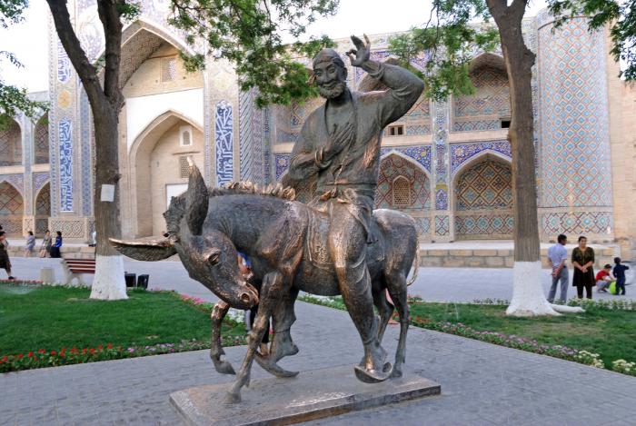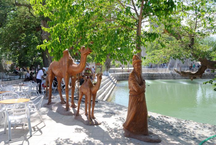 Вдоль водоема стоят скульптурные верблюды с погонщиками. В деревьях притаился веселый Ходжа Насреддин, но его обычно быстро обнаруживают и окружают селфилюбители.