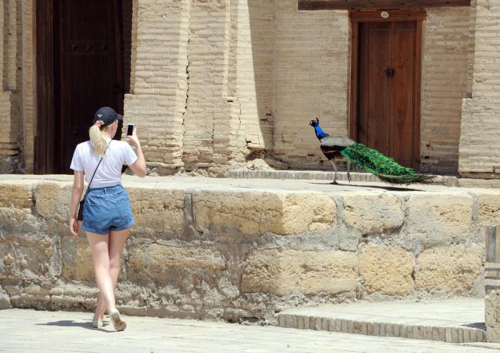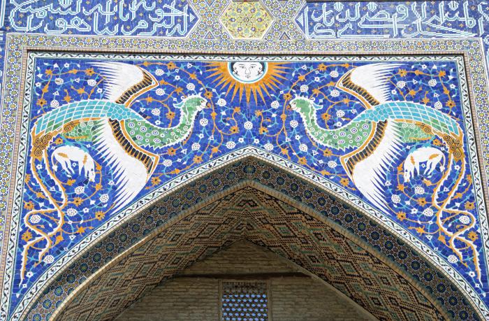 Едем на Ляби-Хауз. Неожиданно, что культурная программа проходит в медресе. Любопытно, что строил-то этот Надир Диван-Беги (тогдашний визирь) сперва караван-сарай (на постоялых дворах можно неплохо заработать), но на открытии здания правитель Бухары Имамкули-хан (племянник визиря) взял, да и объявил его медресе. Пришлось кое-что дополнить в конструкции, добавить второй этаж для проживания студентов. При этом комнату для занятий так и не построили. Вроде бы есть в Коране запрет на изображение живых существ, однако портал украшают две симпатичные птицы счастья.