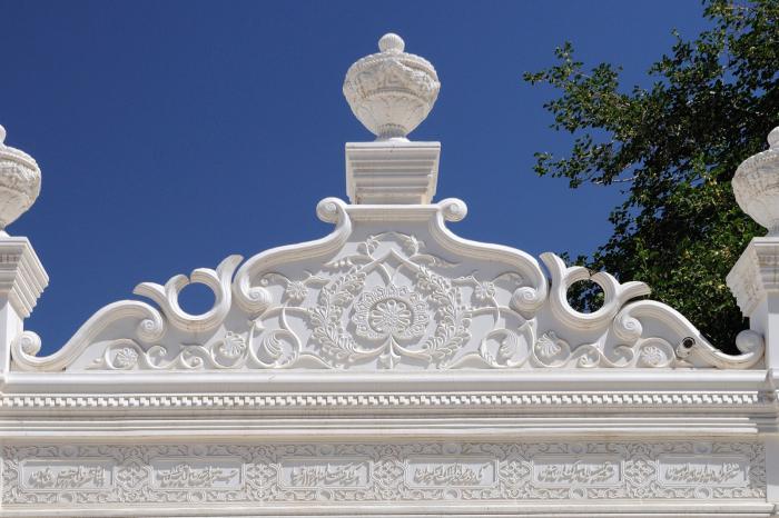 В оформлении минарета присутствует символ, похожий на бантик. Он часто встречается в различных постройках. Интернет услужливо откопал в своих недрах отчет, где есть растолкование этого зороастрийского символа. Верхняя галочка, которая углом вниз, это обозначает хорошие мысли. Нижняя галочка, которая углом вверх, обозначает хорошие слова. А знак равенства между ними — хорошие дела. Окак.