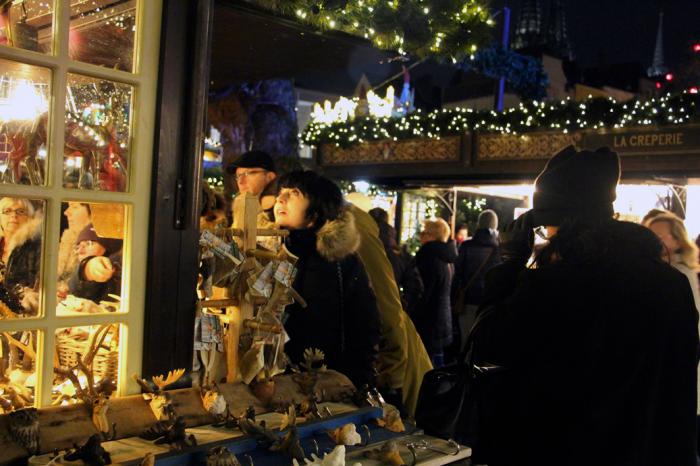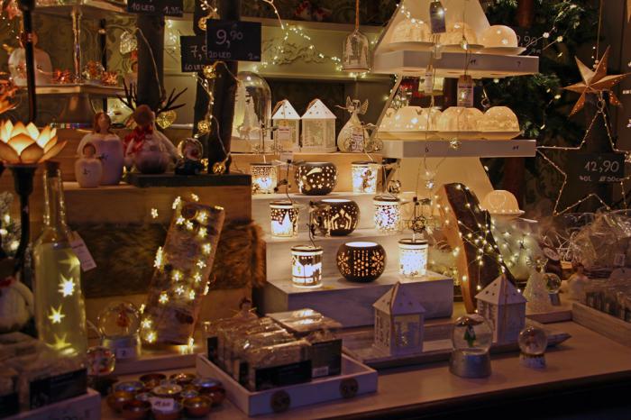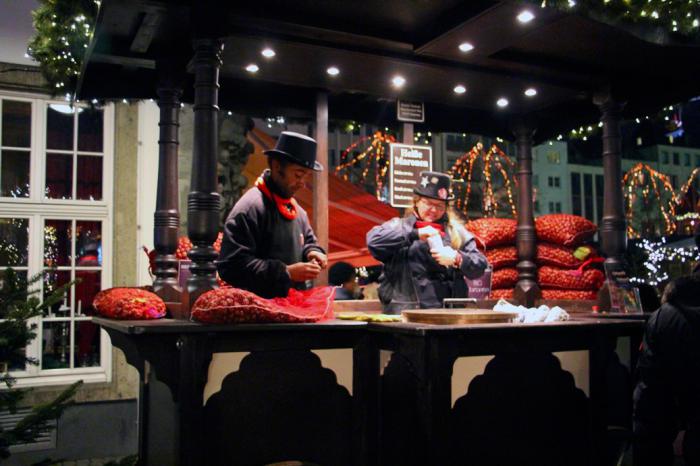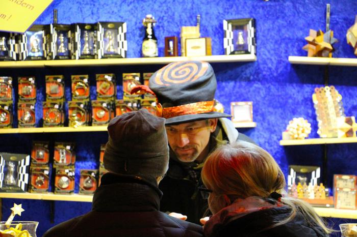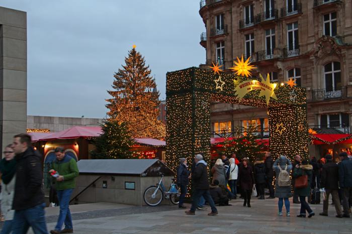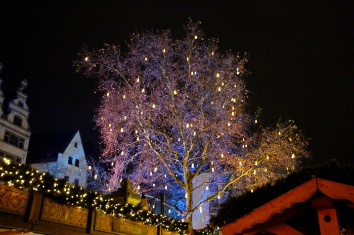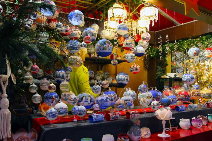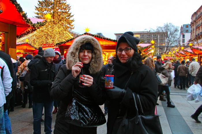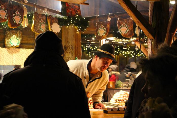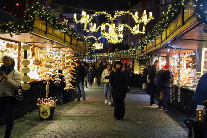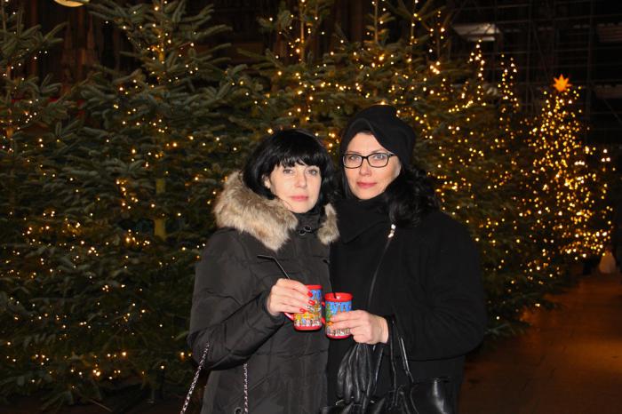 … окружённая со всех сторон торговыми палатками: тут вам и глювайн, и яичный пунш, и вино, и различные традиционные колбаски, и пряники, и reibekuchen – картофельные оладьи (а проще говоря – драники), и… в общем есть, где отвести душу. Для тех, кому неинтересна кулинарная составляющая, широкий выбор рождественских украшений: