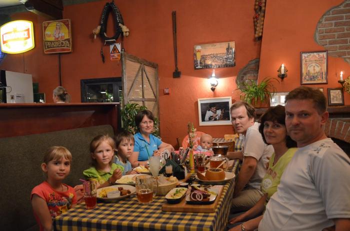 В сегодняшнем дне оставалось немного времени и мы решили пригласить семейство Кирилла в ресторан, тем более что завтрашняя насыщенная программа нам такой возможности предоставить не сможет. Наши гостеприимные уральцы выбрали ресторан чешской кухни «Pan Smetan», в котором мы сразу же и заказали столик на 8 персон, включая маленького Яна.