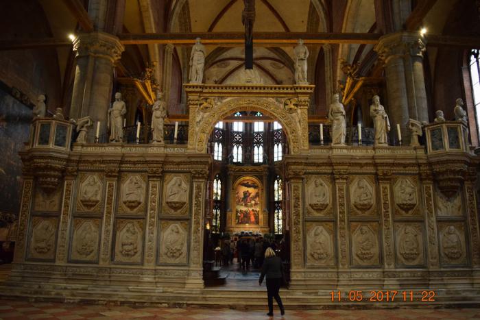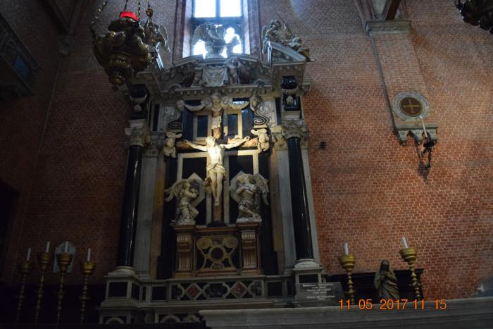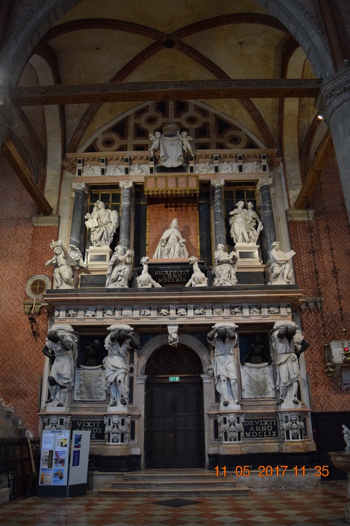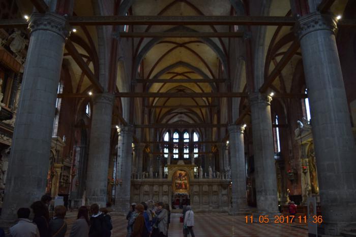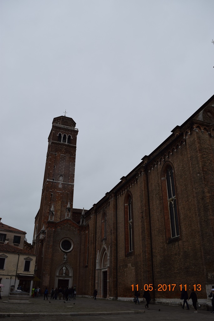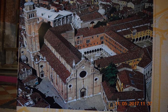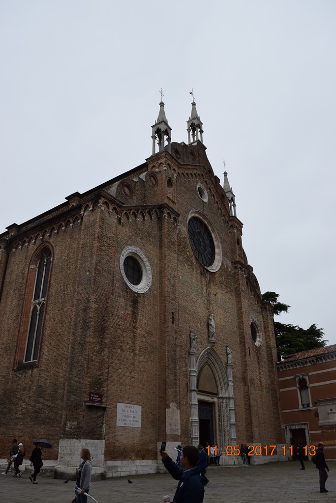 На площадь Святого Роха своей алтарной частью наваливается, как мне показалось, самый большой храм Венеции Собор Санта-Мария Глориоза деи Фрари (Basilica di Santa Maria Gloriosa dei Frari). Он такой огромный, что сфотографировать его целиком довольно трудно.