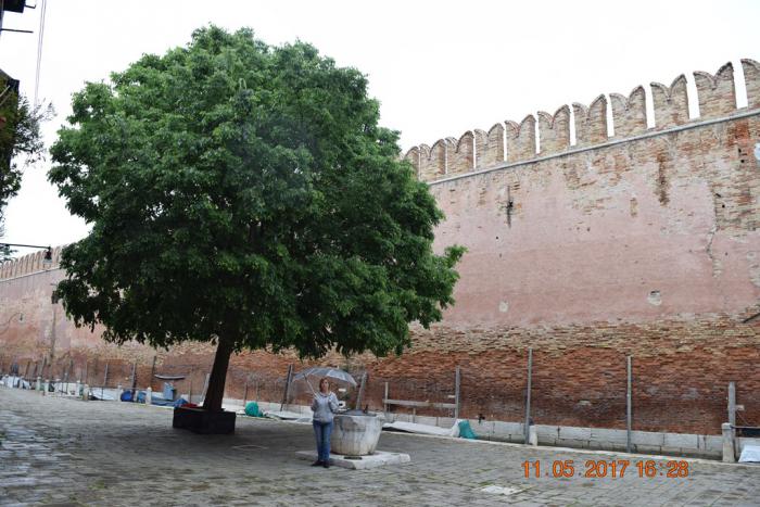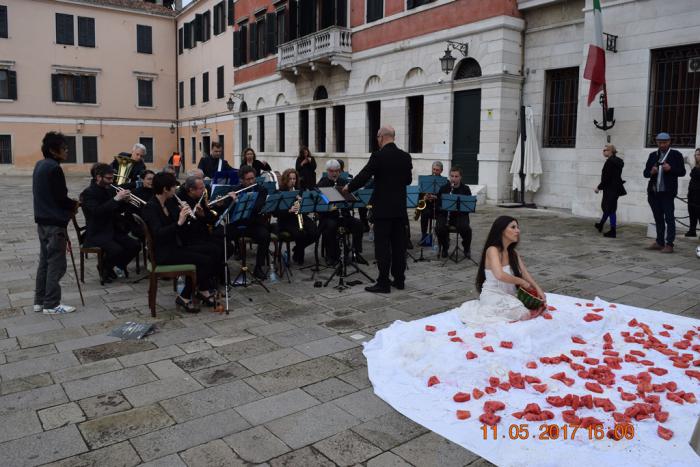 Когда шли в Арсенал возле оздоровительного центра военных моряков Италии видели какое-то непонятное действо. На белом покрывале среди арбузных ошмётков сидит женщина, обернутая белой простынёй, и под заунывную мелодию в исполнении небольшого оркестра, очень флегматично руками ест арбуз.
