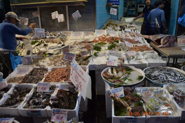 До станции Монтесанто (Stazione Napoli Montesanto) откуда отправляется вагон фуникулёра 15 минут прогулочным шагом. Несмотря на позднее время рыбный рынок «Top Fish Sas Di Tecchio Raffaele E C.» работает.
