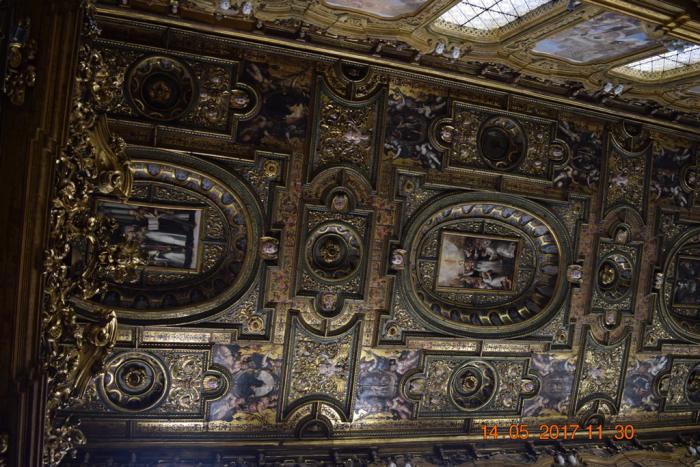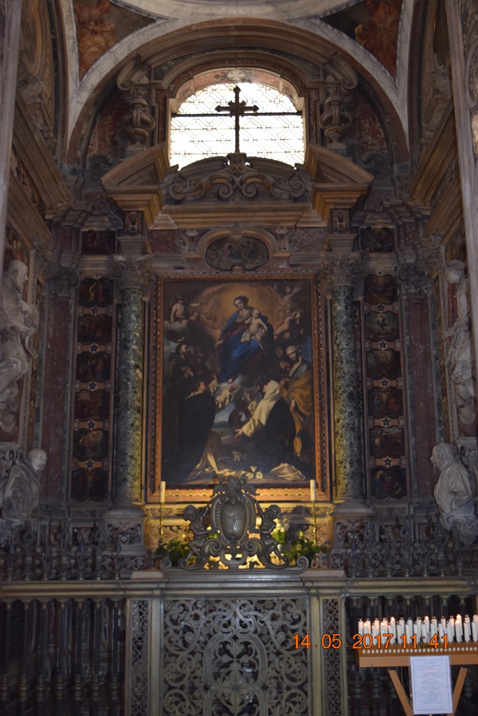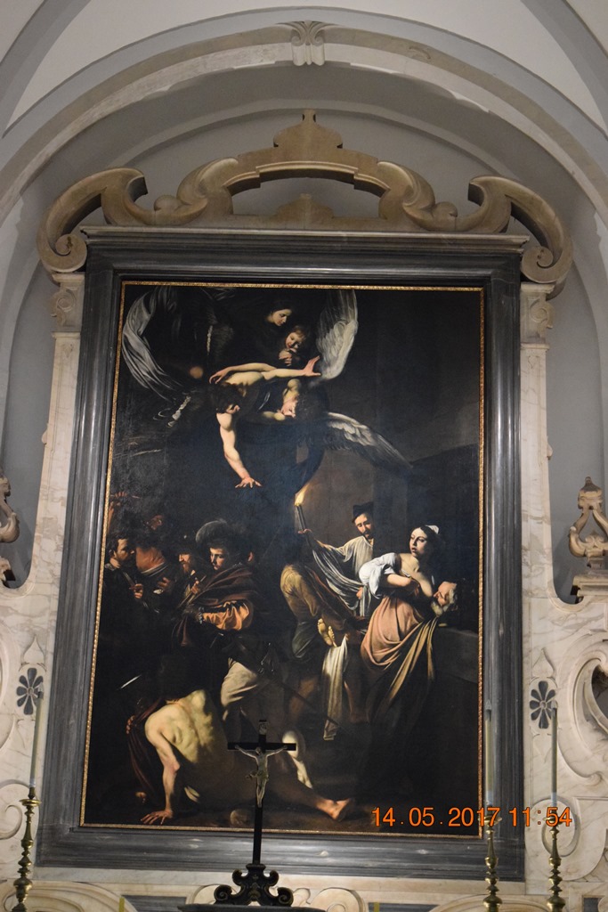 Интересна история этой церкви. В 1601 году семь неаполитанских дворян создали благотворительное общество, которое назвали Pio Monte della Misericordia. Каждую пятницу они приходили в больницу и ухаживали за больными. В 1606 году члены общества построили небольшую церковь. Для главного алтаря за 400 дукатов у Караваджо была приобретена картина «Семь деяний милосердия», которая никогда не выносилась из этого здания. Фотографировать нельзя. Только от бедра, поэтому криво.