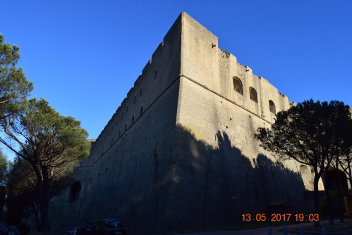 Но вечернему заседанию с бутылкой вина это никак не мешало. Однако рассиживаться времени нет. Нужно успеть попасть в замок Сант-Эльмо (Castel Sant'Elmo). LP вещал, что замок работает до 19-30, поэтому, мы как раз успеваем со смотровых площадок замка полюбоваться Неаполем в лучах заката (самое выигрышное освещение города с этой точки).