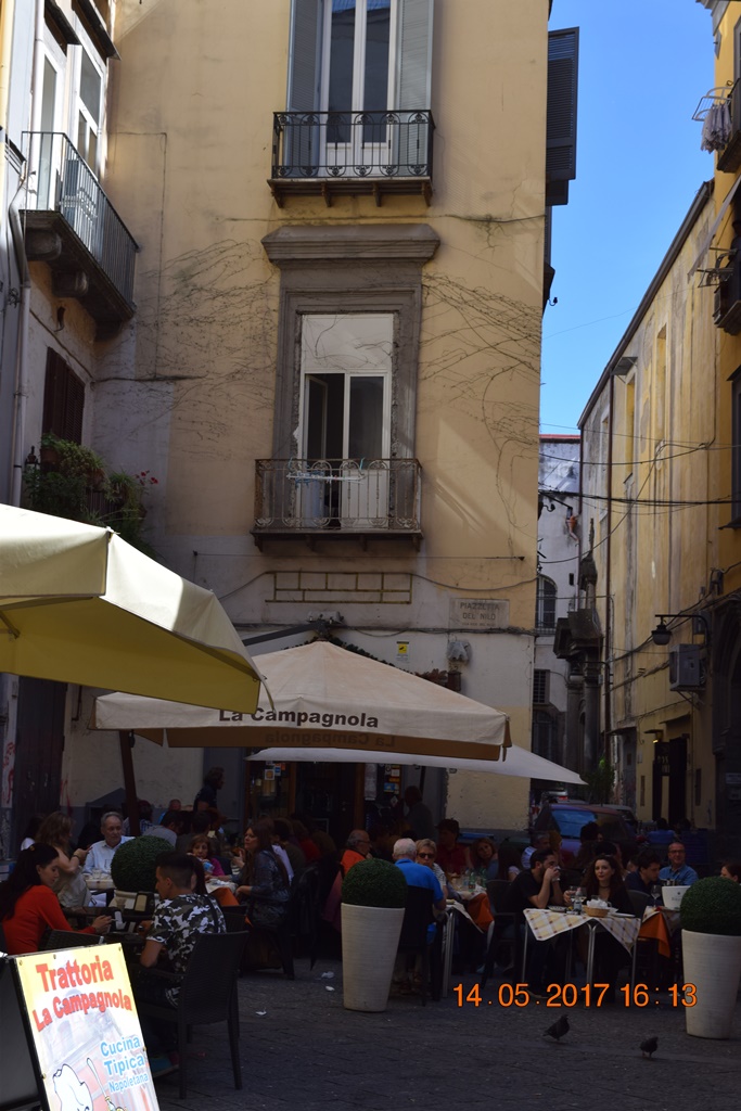 До отправления парома ещё четыре часа, он отчаливает в восемь вечера, Но нам нужно решить одну проблему. Впрочем, это не проблема, но только не в Италии, нам нужно пообедать, а рестораны не работают, сиеста. Нельзя сказать, что поиски харчевни были очень продолжительны, но обстановка была нервная, на грани голодного обморока. Как говориться в одной очень умной книге: «…ищите и обрящете, толцыте и отверзется вам…». Вот и мы в каком-то закутке на пересечении Piazzetta Nilo и Vico Donnaromita нашли неприметную тратторию «La Campagnola». Здесь было много людей, половина столиков была сдвинута для большого семейного обеда, что было косвенным признаком неплохого заведения.