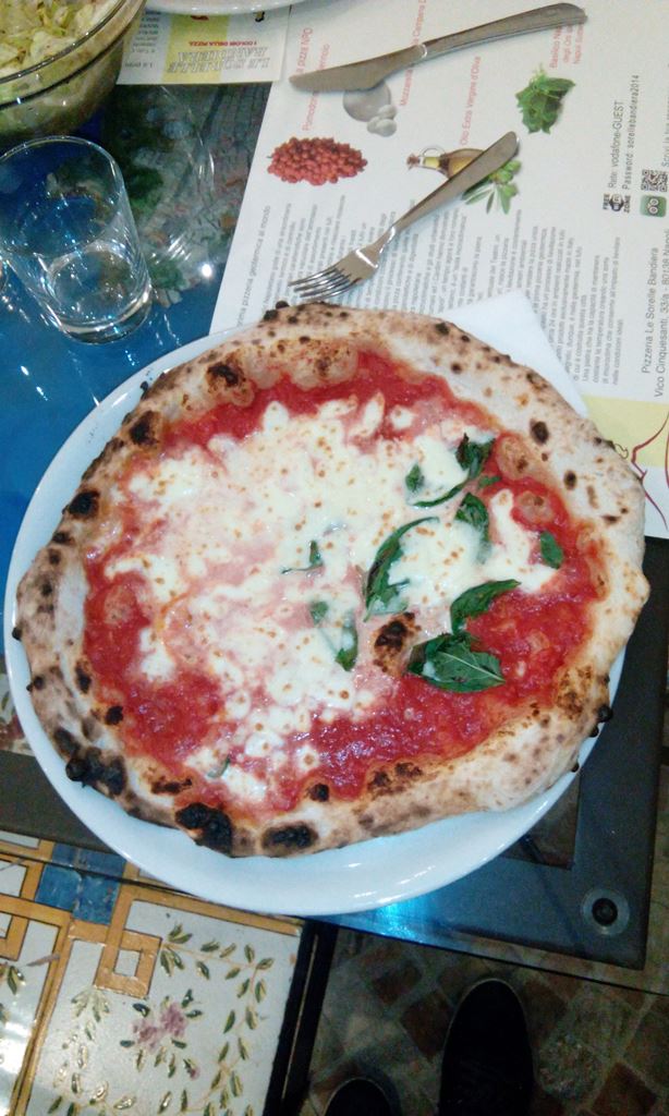 Вот и нам нужно покормиться. Мы ведь в Италии, более того в Неаполе, так сказать, на малой родине пиццы. Ужинать конечно же в пиццерию. До самых знаменитых заведений не дотянули. Побродили-побродили, целых минут 15, и набрели на пиццерию «Le Sorelle Bandiera» на Vico Cinquesanti, 33 a.