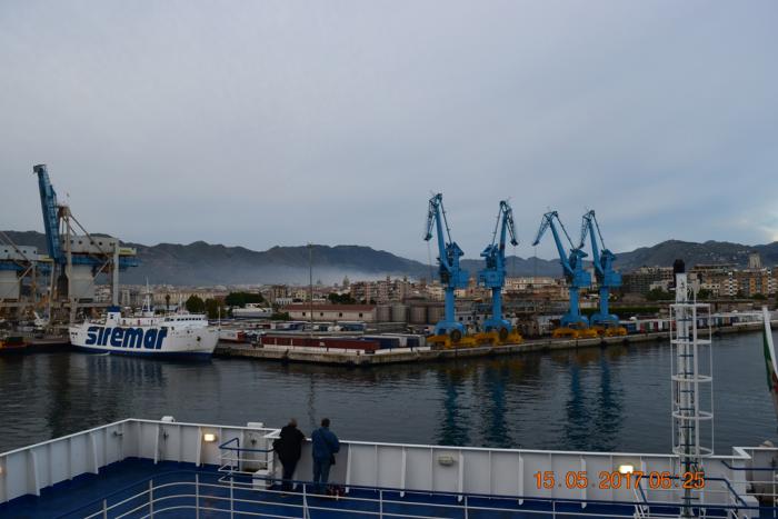 По расписанию паром в Палермо прибывает в 6-15, но суетиться, хватать свои вещи и мчатся, сдувая со лба прилипшую потную чёлку не стоит. Швартовка и выгрузка парома дело не торопливое. Совершенно спокойно можно выпить чашечку кофе, принять ванну (на какаву с чаем уже времени не хватит), а так же понаблюдать за слаженными действиями команды судна.