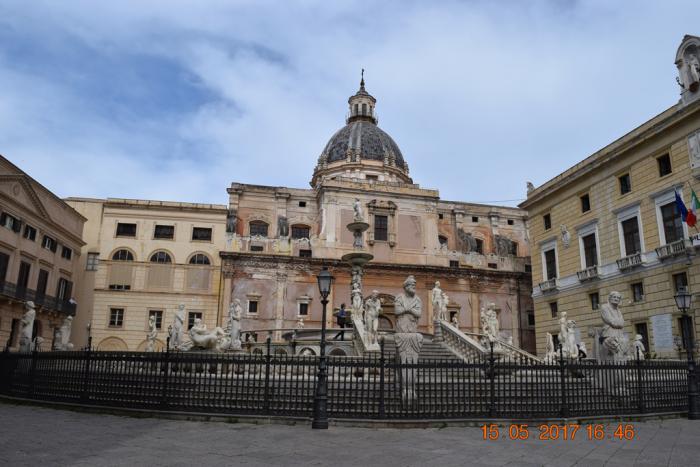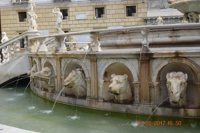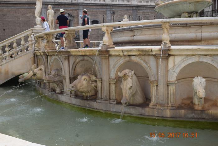 Этот огромный фонтан в 1554 году начал делать флорентийский скульптор Франческо Камильяни по заказу богатого флорентийца Луиджи-де-Толедо. Но, как у нас говорят: «От тюрьмы и от сумы не зарекайся». И когда над головой Луиджи-де-Толедо повисла сума, он фонтан продал городу Палермо. Так в 1574 году фонтан в разобранном виде прибыл в Палермо и в 1881 году был собран перед зданием сената Палермо (Palazzo Pretorio). В Palazzo Pretorio всегда заседало руководство города. Сейчас там мэрия. В 18-19 веках фонтан считался своего рода изображением коррумпированного муниципалитета Палермо. Возможно из-за скульптур животных во втором ярусе фонтана, а там есть и ослы, и бараны, и собаки и т.д. и т.п., таким образом можно подобрать животное-отражение любому чиновнику.