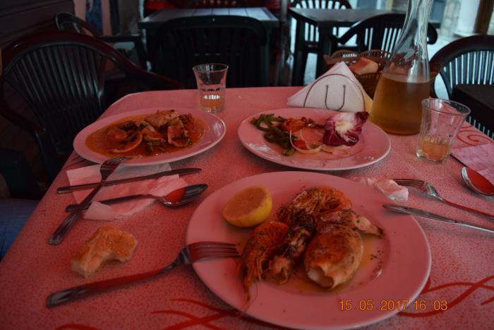 жаренные морские гады, жаренная кефаль под томатным соусом и вино