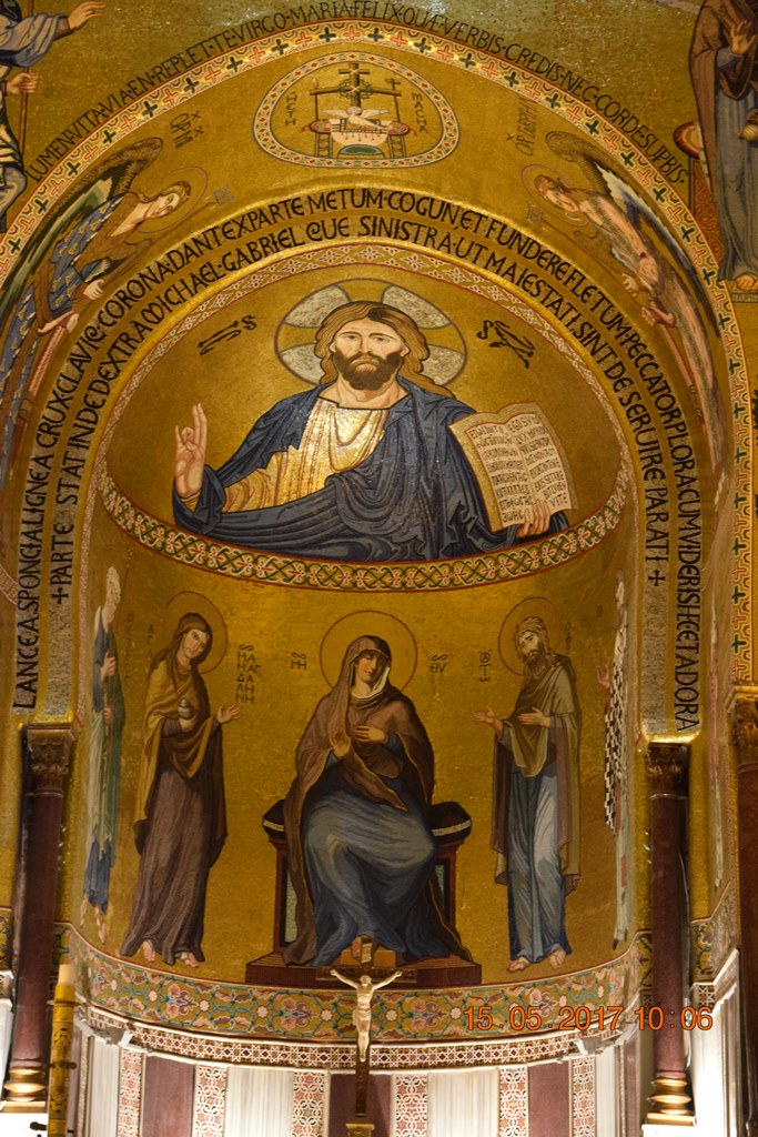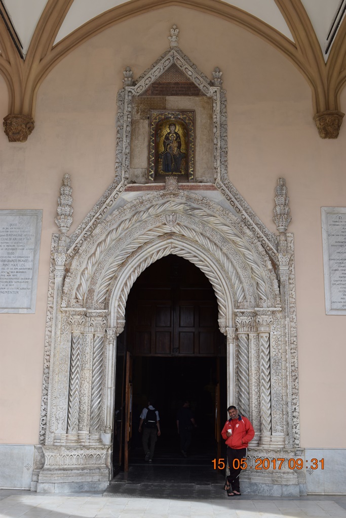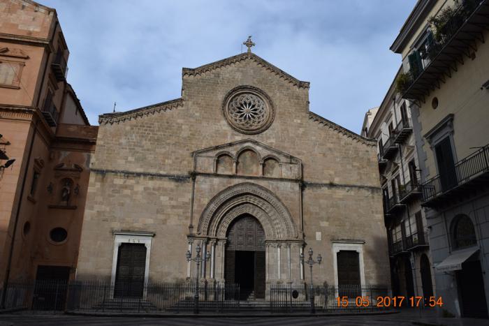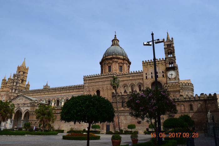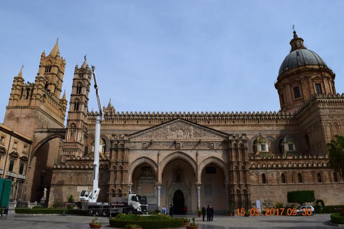 Полное его название Собор успения пресвятой Девы Марии (Cattedrale metropolitana della Santa Vergine Maria Assunta). Первую раннехристианскую церковь, построенную на этом месте, разрушили вандалы в середине 5 века. Второй храм на этом месте был построен в 604 году. После вторжения на остров сарацинов в 831 году церковь была превращена в мечеть и была мечетью до изгнания арабов норманнами в 1072 году. Тогда здание не перестраивали, а только из минарета сделали колокольню. В 1169 году в результате землетрясения была разрушена колокольня и фасад здания, после чего была капитальная перестройка в арабо-норманнском стиле. Потом в 16-17 веках её перестраивали испанцы. Последняя реконструкция датируется началом 19 века. Я так долго перечислял эти реконструкции для того что бы было понятно из-за чего в архитектуре собора такое смешение разных стилей: ближневосточных, центральноевропейских и североевропейских.