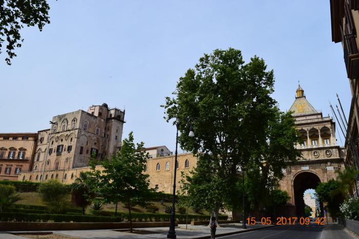 В двух шагах от собора Королевский или Норманнский дворец (Palazzo Reale или Palazzo dei Normanni) к которому примыкают Новые ворота (Porta Nuova), их видно в конце улицы.