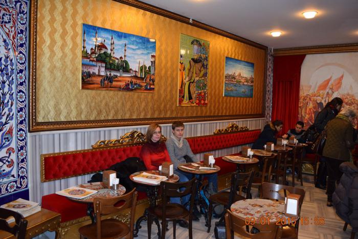 Ресторан удовлетворил по всем критериям. Мы сидели на втором этаже одни, музыка не орёт, обслуживание хорошее, кухня очень хорошая, расплатиться можно картой. Цены вполне приемлемые: горшок с бараниной, ещё одно мясное блюда, две турецких закуски из баклажанов и из помидоров, бутылка сухого вина и чай – 205 лир.