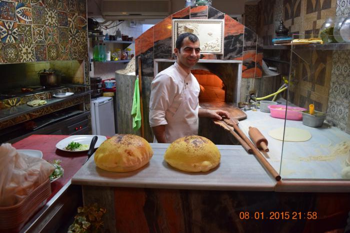 После бани захотелось поесть. Идём, высматриваем какую-нибудь харчевню. И вот что-то похожее. Это оказалось небольшая пекарня с тремя столиками. Пекарь сам принимает заказы по телефону, сам выпекает и сам же доставляет заказ по адресу на мопеде. За три лахмаджуна, салат и три чая он взял 8 лир. Вот это бюджетный перекус!