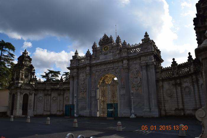 Ну, что ж прогуляемся вдоль дворца по улице Долмабахче, посмотрим на дворец сквозь забор, а на площади Бешикташ на автобус и в крепость Румели Хисары. До площади Бешикташ полтора километра, и что нам после вчерашних восьми километров пройденных пешком. Но, фиг вам посмотреть сквозь забор, это вам не Петергоф или Вена, с их ажурными заборами в Петродворце и Шёнбрунне, здесь глухой забор метров шесть высотой. Вот иди, мил друг, и любуйся. Но ведь должен же быть «луч света» какой-нибудь. А вот он. «Султанские ворота».