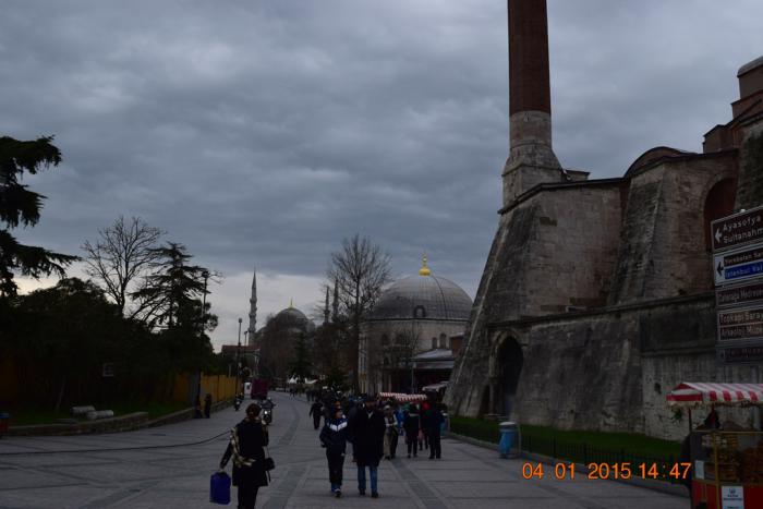 Передо мной дорога, ведущая на площадь. Справа видно контрфорсы Святой Софии, а на заднем плане мечеть Султанахмет.