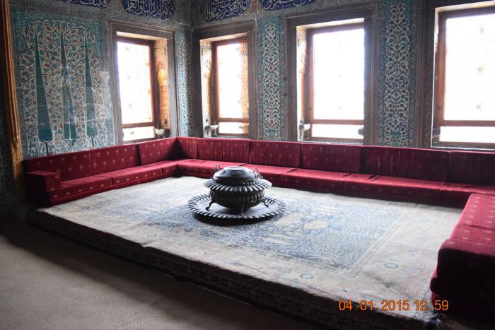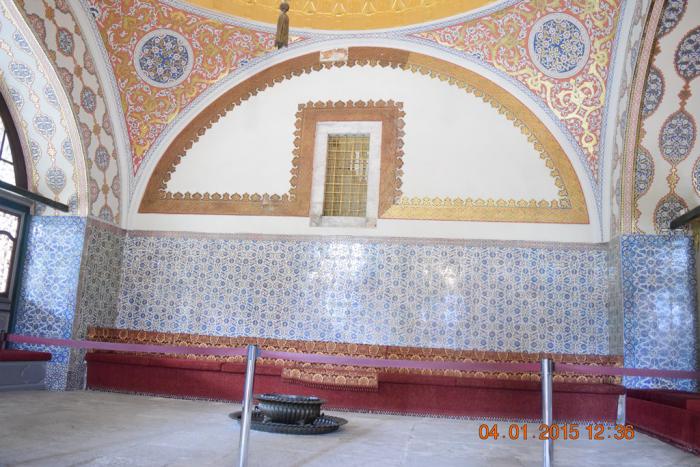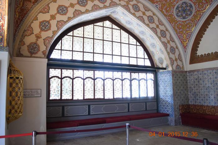 В стене над местом великого везира окошко с решёткой, через которое султан мог наблюдать за работой своих советников.