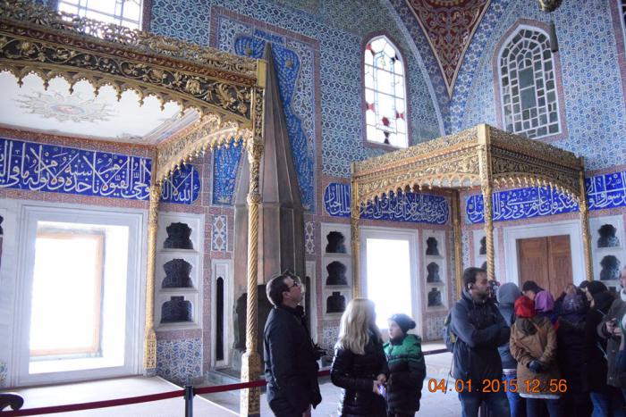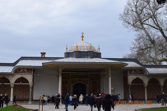 Сразу за воротами, закрывая двор, стоит Тронный зал, где султан принимал с докладами везира, иностранных послов с дарами.
