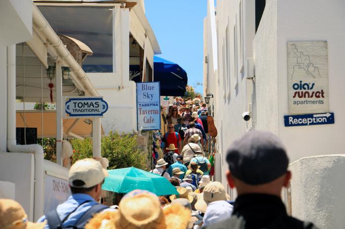Количество желающих полюбоваться здешними красотами зашкалило до такой степени, что греческие власти были вынуждены в 2016 году ввести ограничение на посещение острова. Озабоченность властей вызвана наплывом так называемых «круизных» туристов: их ежедневное количество стало «головной болью» для коммунальных и транспортных инфраструктур. В особенности транспортных, о чём нас предупредили сразу: узкие дороги маленького острова не в состоянии справиться с возросшим числом туристического транспорта, и прежде всего огромными автобусами. Так, что если повезёт, как сказала гид, мы сегодня в пробку не попадём. Не повезло – попали, и потеряли около часа драгоценного времени, которого у нас и так-то было в обрез.