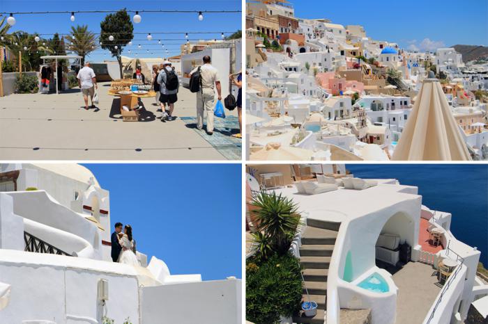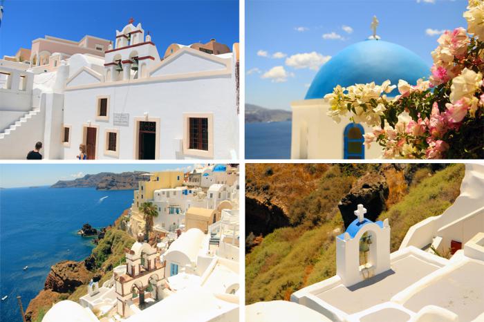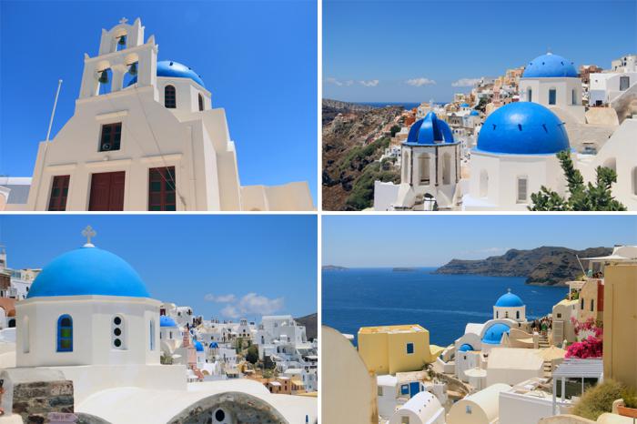Однако, вернёмся к реальности. Дневная программа нашего пребывания на Санторини, как известила нас Елена (напомню – гид), включала четыре пункта: город белых домиков Ия (Oia), островная столица — его тёзка — Фира, одна из местных виноделен с дегустацией и посещение пляжа в местечке Перисса (Perissa), с купанием и обедом в одной из таверн. План обширный, но на первый взгляд, вполне выполнимый. После первой остановки моё мнение резко поменялось. Но обо всём по порядку. Первым пунктом нашей экскурсии стала Ия, та самая, чьи белоснежные домики и голубые купола покорили сердца путешественников со всего света, благодаря выразительным фотографиям. Каюсь — грешен, я и сам не удержался от соблазна сделать таковую заглавной данного топика. Кстати, доминирование в местной архитектуре белого и синего цветов – цветов национального флага, объясняется скрытым протестом греков на его запрет нацистами во время оккупации острова.