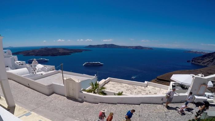 Расположившись на самом краю 260-метровой скалы, Фира, как и положено столичному городу, гордо посматривает на свои владения – вся кальдера как на ладони: