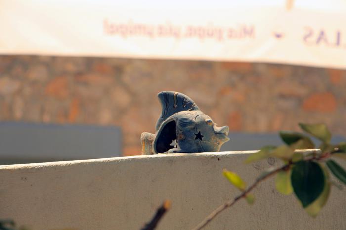 Тем, в свою очередь, предлагаются три варианта подъёма в город: на фуникулёре, пешком по лестнице, состоящей почти из шестиста ступеней, или на популярной разновидности местного такси – старом добром ослике. Будь у меня время, я обязательно спустился-б вниз, но времени хватило лишь на десяток-полтора снимков. Эту рыбку Фира мне подарила на прощание:
