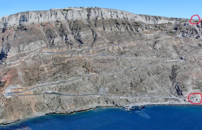 Прибыв в порт Санторини Афиниос (Athinios), мы погрузились в автобус, который, петляя по серпантину с разворотами на 180°, поднял нас от побережья на верхнее плато. Для наглядности приведу скрин с гугловской карты, где красным обозначены верхняя и нижняя точки подъёма: