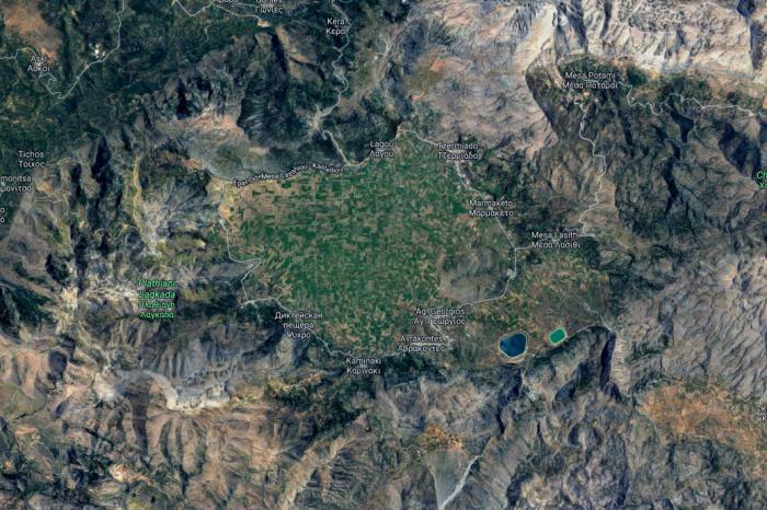 … поехали дальше. В какой-то момент горы неожиданно закончились, и мы оказались в одном из живописнейших уголков Крита — на плато Лассити. На Googlе-вской карте — это зелёный оазис в окаймлении горного хребта: