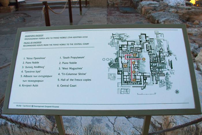 Можно согласиться с критикой в адрес сэра Эванса за вольную трактовку восстановленных элементов, но в чём он был безусловно прав, так это в гармонично выбранном балансе сохранённых и реконструированных фрагментов, предоставляя туристам право решать — согласиться с его вариантом или самим «дорисовать» картинку прошлого. Возле большинства экспозиций установлены информационные табло, рассказывающие об осматриваемом объекте. Очень удобно и познавательно, если вы конечно сильны в греческом или английском: