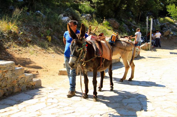 Испытывая одинаково бережное чувство и к валюте, и к животным, мы пошли пешком. Уходящая вверх тропка, помимо красочной рельефности, запомнилась неповторимым букетом, распространявшимся вокруг продуктов «ослячей» жизнедеятельности, коими она без скупости помечена. Нельзя не отметить, что на обратном пути дорожка была так тщательно убрана, что не осталось даже запаха. Пройдя больше половины пути, я вспомнил о билетах — оставалось надеяться, что касса окажется наверху. Ответ спускающихся предшественников успокоил. Заплатили 12€ и — добро пожаловать в колыбель Зевса! Ну, что сказать — никакой трепетности или необычности: темно, сыро и прохладно. Как раз тот случай, когда