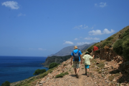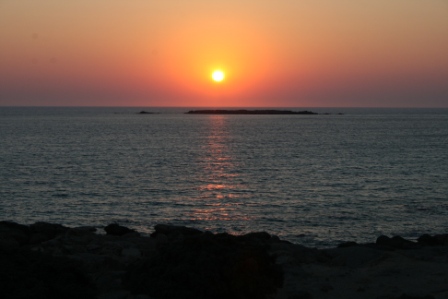 В качестве развлечения мы выбирались на западный берег Крита в местечко Фаласарна. За Киссамосом приличная асфальтированная дорога заканчивается и начинается узкая грунтовка, на которой в некоторых местах две машины разъехаться не могут. В общем не самая комфортная для поездки дорога. В самой Фаласарне устроен симпатичный романтический пляж, над которым можно посидеть в кафе и проводить уходящее солнце.