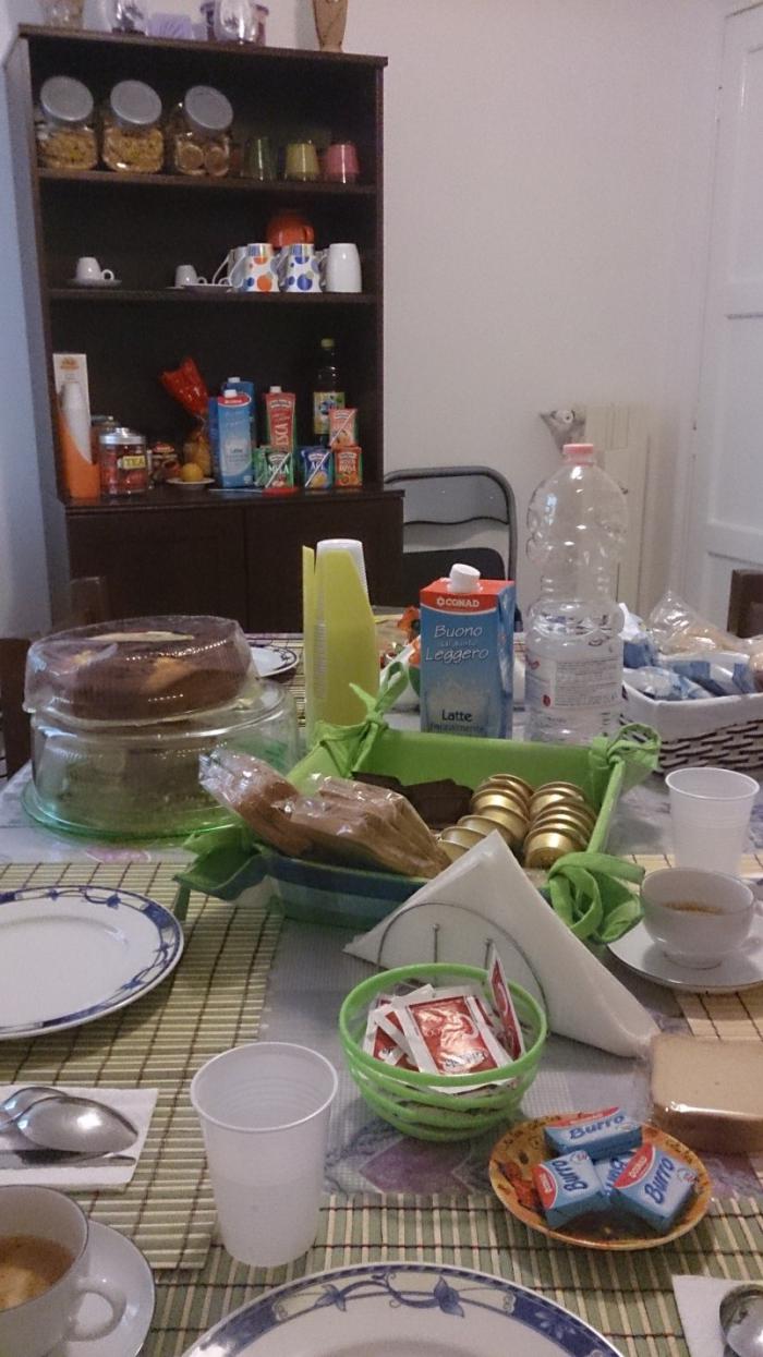 Проснулись в 7:30. Завтрак (скудненький, без гречки и хоть какого-то намёка на что-то мясное, как мы любим) проходит в соседней комнате: один большой стол, сервированный человек на 8, различные фрукты, мюсли, круассаны, кофе, чай, соки, молоко.