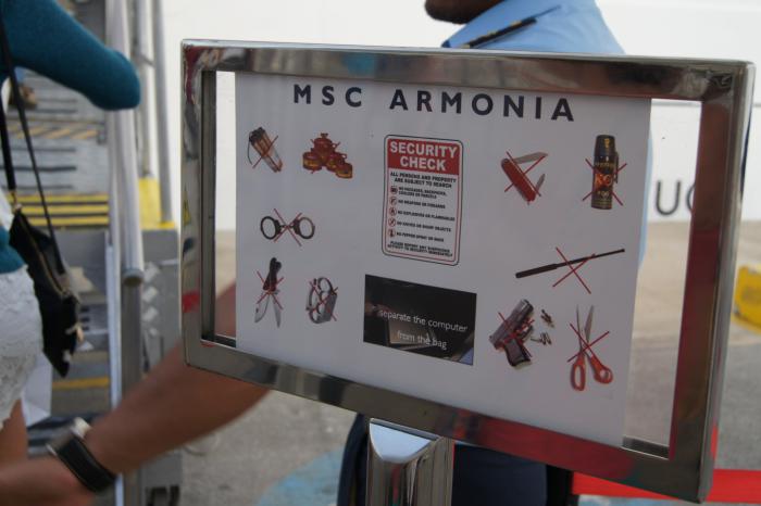 Чудом пронесли 1,5 бутылки вина на борт, хотя служба безопасности меня остановила и уже собиралась забрать, но неразбериха и небольшой сбой аппарата, который просвечивал сумки + дядька, который звенел под рамками, сделали своё дело, и нам удалось скрыться в толпе.