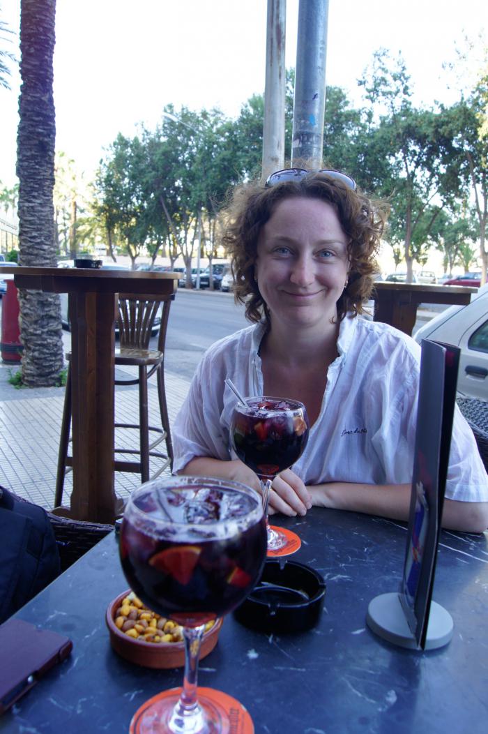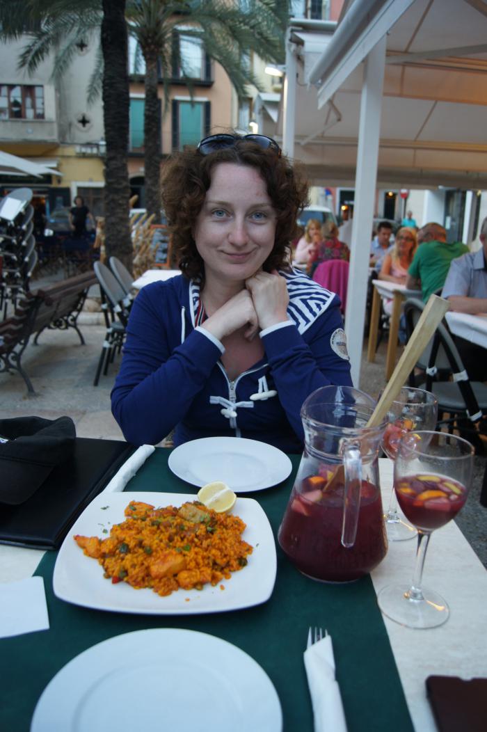 Пальма – это Испания, а значит обязательно нужно выпить сангрию и съесть паэлью. Первой остановкой была кафешка на улочке, которая идёт вдоль набережной города. Там мы опрокинули по хорошему стакану нашей любимой сангрии (5,5 Еуро за стакан) и немного передохнули, а заодно через ВиФи отписались всем, что у нас всё хорошо.