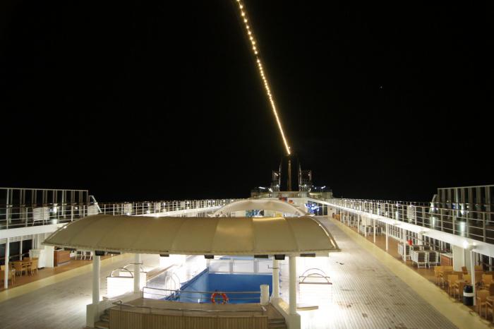 Шоу мы, всё-таки, пропустили. Далее пошли гулять по верхней палубе корабля. Купили в бутылках Францисканер, и пошли валяться на нос лайнера в уютных шезлогах — домиках.