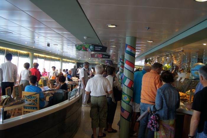 Решили пообедать там, где континентальный завтрак. Пришли рано, заняли хорошие места на корме. Континентальный обед – это тот же шведский стол, бери что и сколько хочешь. Да, тут, конечно, присутствует очередь, но это не томительное ожидание еды от официантов, как в ресторане Marco Polo.