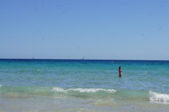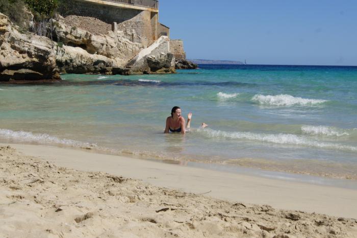 И вот она — Пальма! Первым делом мы пошли искать пляж. В форумах я прочитал про нудистский пляж (очень красивый, мало людей и всё такое) в шаговой доступности, но пройдя нужный поворот, мы на него не попали. Может, и к счастью. По here maps посмотрели, что недалеко от нас есть ещё один пляж и направились к нему, зайдя перед этим в Carrefour (супермаркет) и купив Cava (шампанское на испанский лад) и воды. Пляж находится в пригороде Пальмы — Platja Cala Major.